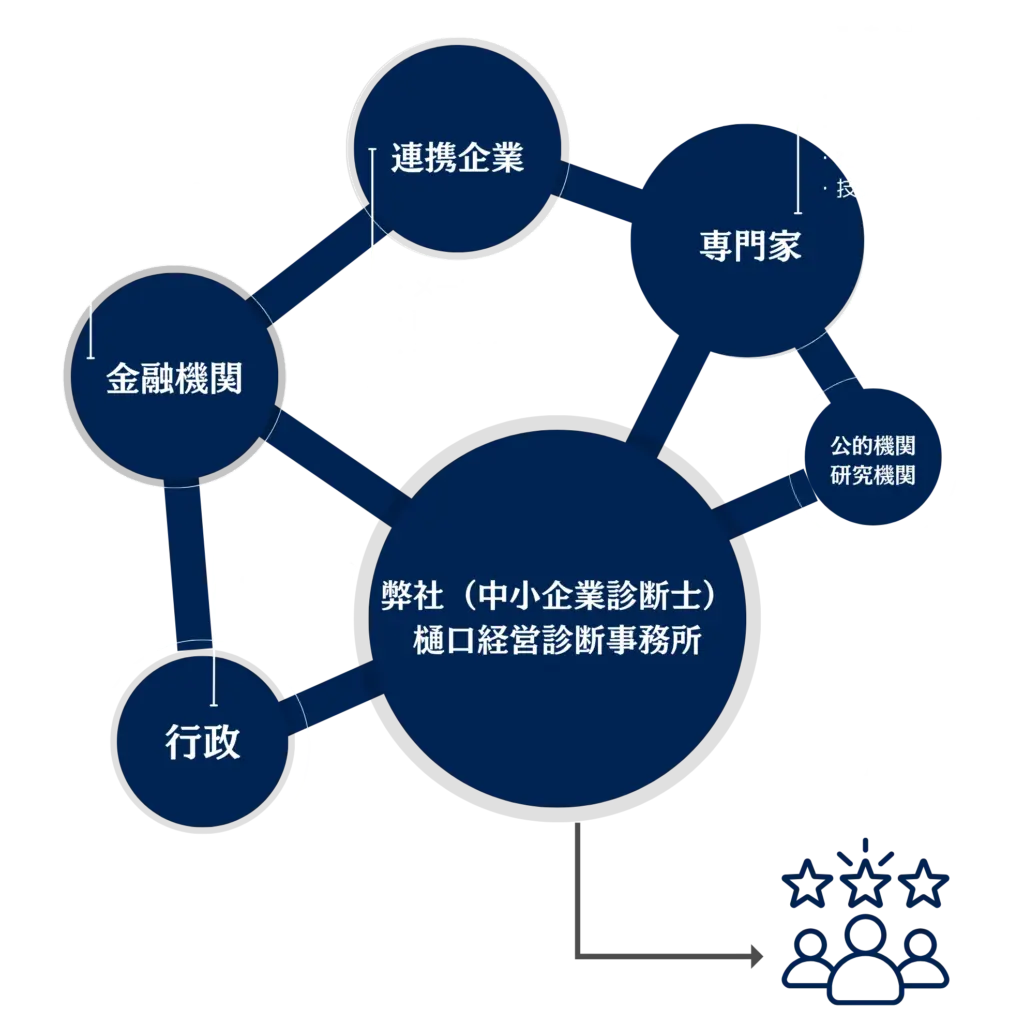 樋口経営診断事務所は、さまざまな領域の専門家(司法書士、不動産鑑定士、税理士、社会保険労務士、行政書士、技術士など)と協力し合うことで効果的な支援を実施しています。